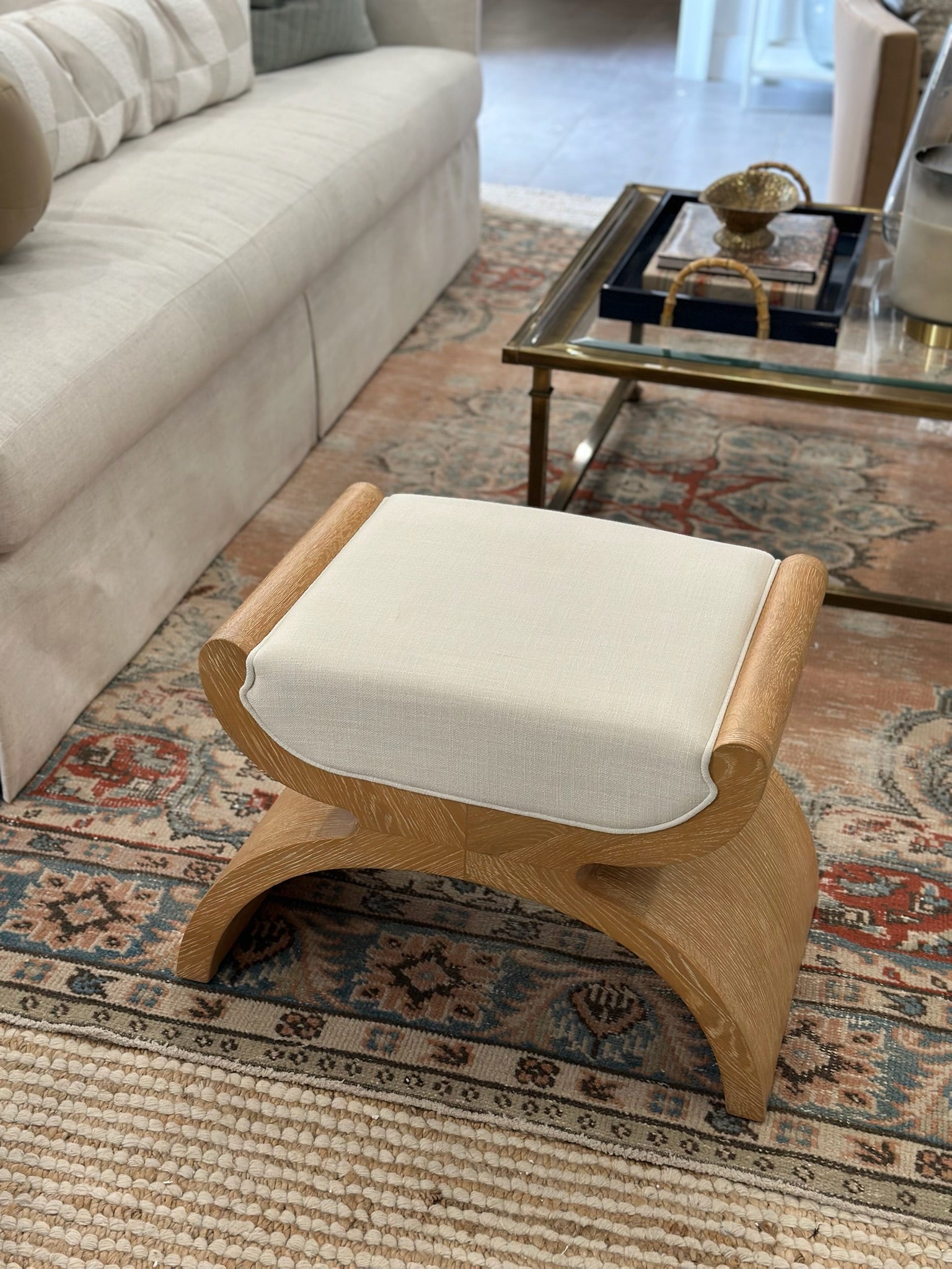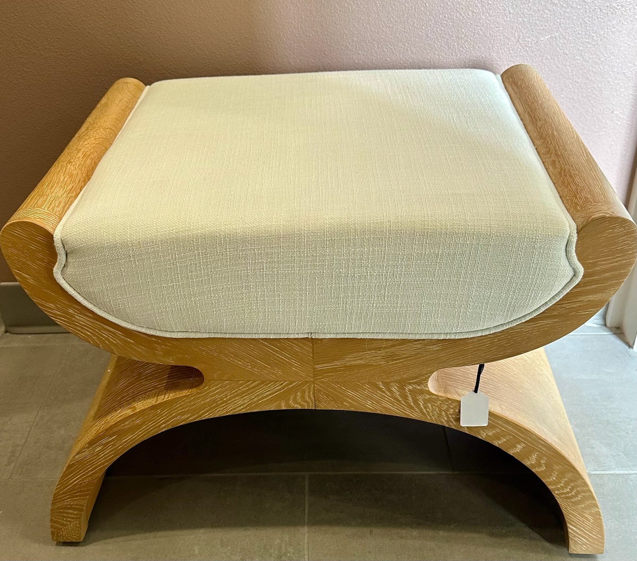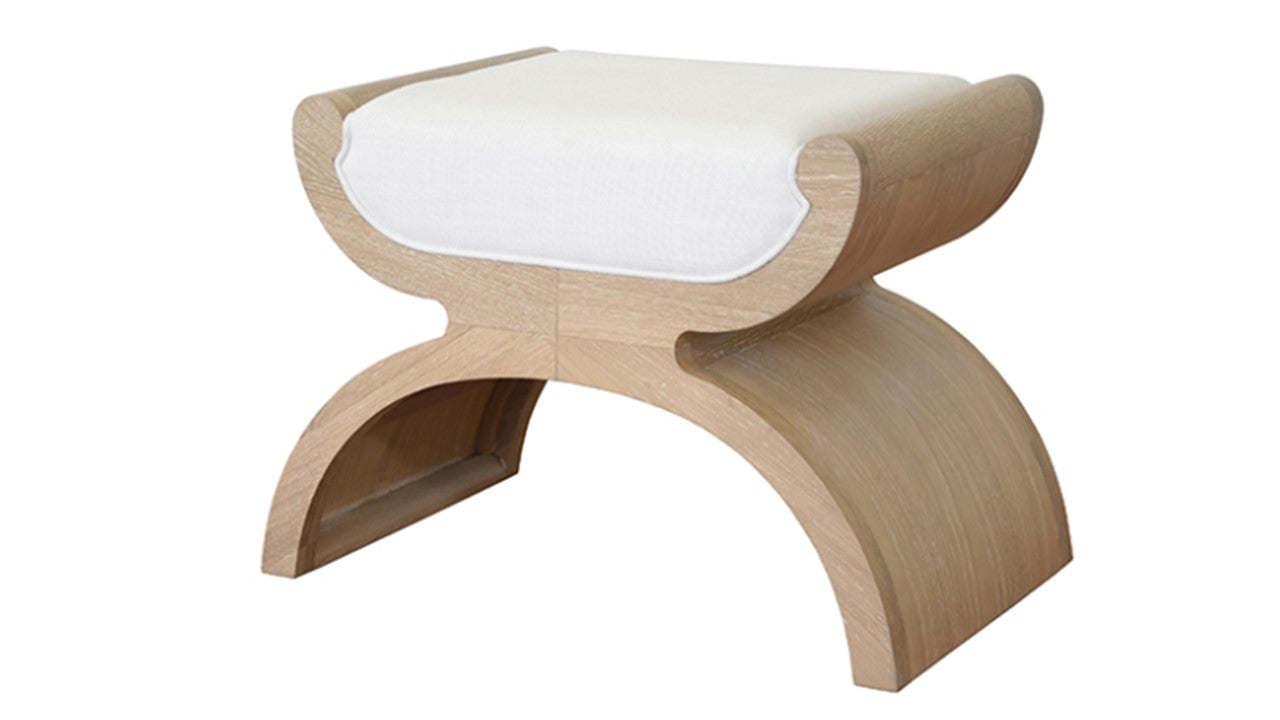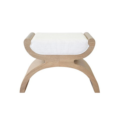 With sweeping curves and sculptural shape, the Asian-inspired Janna stool is a true conversation piece. With natural oak grain texture and white linen cushion, this stool adds a punch of personality to any room. Create a stunning entry way by bunching Janna stools beneath a console, then introduce as extra seating when hosting family and friends.